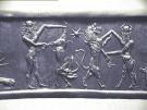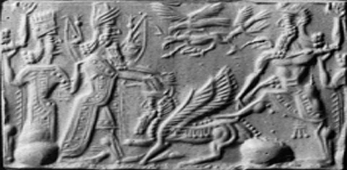 Gilgamesh und Enkidu töten den Himmelsstier, Istar steht links daneben. |