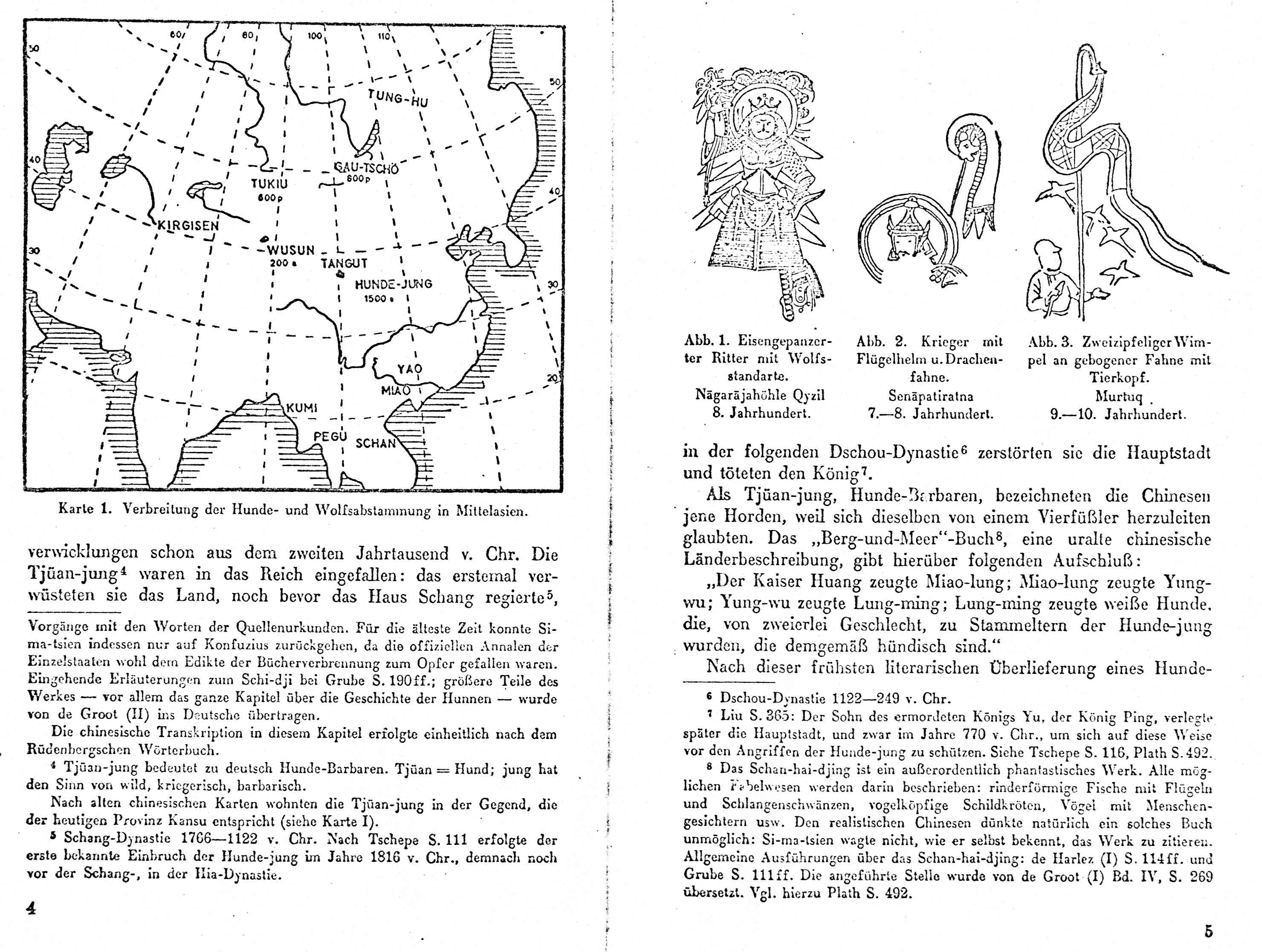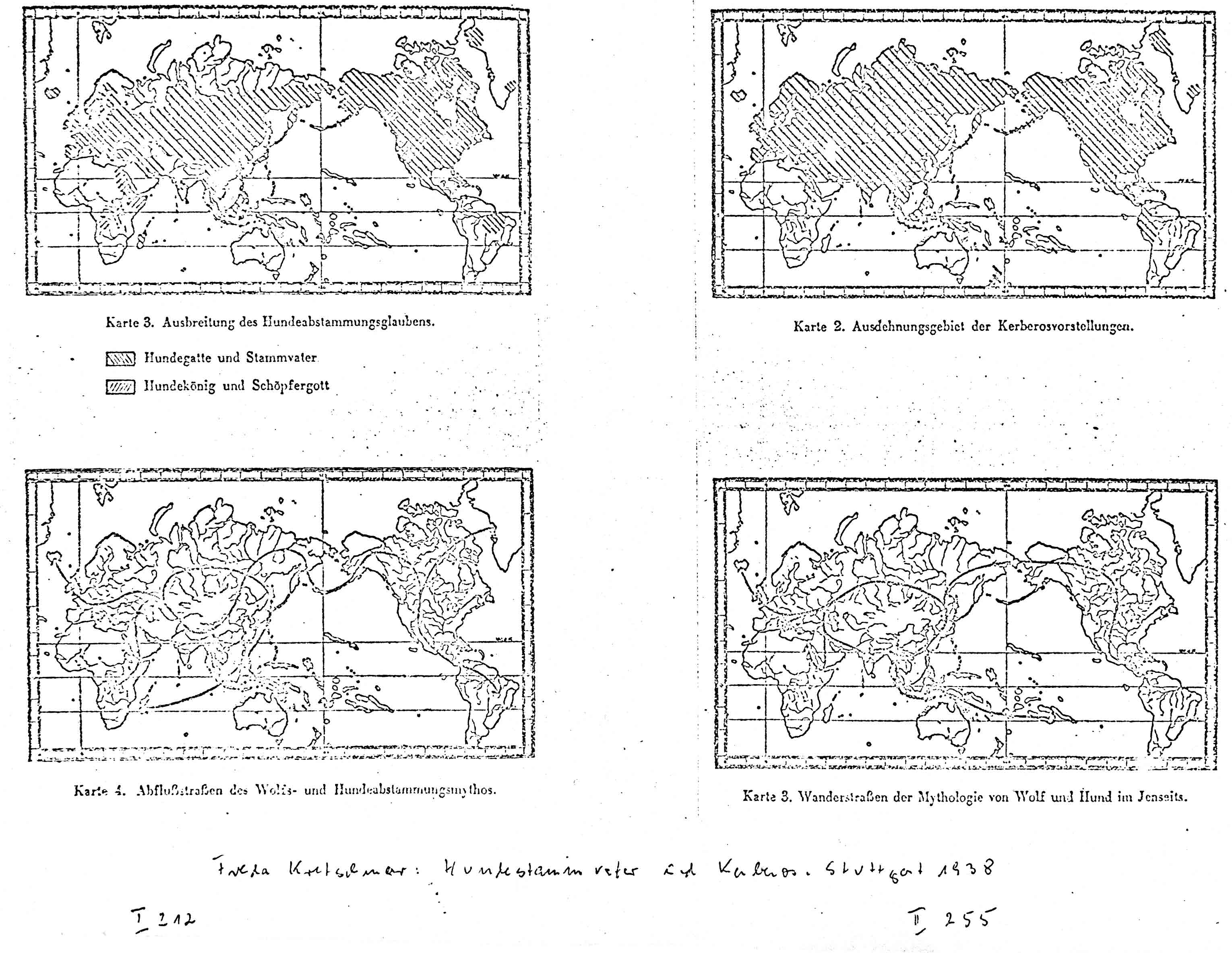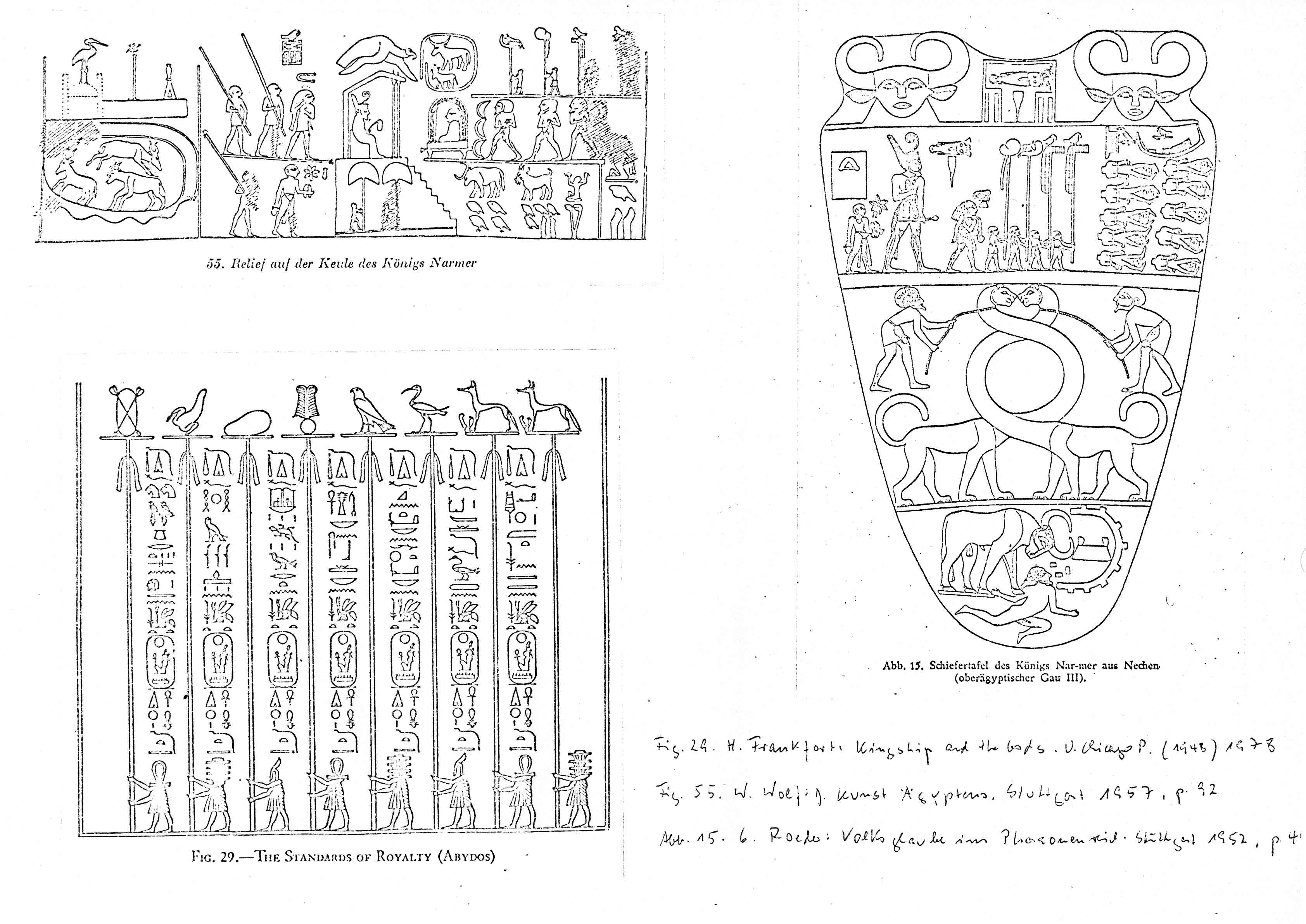der Bildsäulen vier Buchstaben (téssara grámmata). p11 Bei den Bildsäulen handelt es sich um das sog."Horusgeleit" ( s.J.v.B.s.v. L.Ä. III 51f.; Abb. aus Abydos s. Frankfort: Kingship and the Gods Fig.29, s. Beilage 4), auf Ägyptisch smsw Hr, ntrw smsw Hr, über das u.a. das Lexikon für Ägyptologie Auskunft gibt: "Seit vordynastischer Zeit bezeugte Gruppe von Götterbildern auf Standarten in Begleitung des Königs, erstmals so genannt in den Sedfest Darstellungen des Ni-user-Re und später Osorkons II. Urgprünglicher Grundbestand (später erweitert):Schakal (auch doppelt vorkommend), Falke (auch doppelt) und Balg (oder Sack, sog.'Chons Symbol'), seltener Ibis und Min Symbol, nur einmal auf Keule des Königs Skorpion Seth Tier (doppelt) und Wüstenhieroglyphe" "Dargestellt auf Paletten (Schlachtfeld ,Stier u. Narmer P.) und Prunkkeulen (Skorpion, Narmer) der spätvorgesch. Zeit. Auf der Städtezerstörungspalette handelt es sich nicht um Standarten, auf der Löwenjagdpalette nicht um das Horusgeleit..." Was der Herr von Beckerath über einen "ursprünglichen Grundbestand" zu sagen hat, braucht uns nicht zu kratzen; es sieht nun einmal so aus, als werde ein Horus' nicht kontinuierlich von den gleichen erlauchten ,Persönlichkeit' begleitet. Von jedem einzelnen der Horusbegleiter ließe sich lange reden: darunter befindet sich, von Beckerath nicht erwähnt, das sog.'Symbol' der Selqet, d.i. von Scorpius; das sog. Min Symbol ist aller Wahrscheinlichkeit nach der Donnerkeil bei Mandestämmen im Westsudan hat es sich als Abzeichen des Faro wiedergefunden; zur Gänze undeutbar bleibt vorläufig der erwähnte Sack oder Balg (vgl. Kees, Hermann: Der Gotterglaube im Alten Aegypten, 2nd ed. Berlin, 1956. p101 f. u. 108 f., s.a. 15). Was die Deutung der beiden Hunde auf die Wendekreise anlangt, von der der Clemens Alexandrinus gehört hatte, so sind da, außer dem Ramesseum, zwei vordynastische, also vor -2900 anzusetzende, sog. Schminkpaletten zu berücksichtigen: 1) die sog.Tierpalette aus Hierakonpolis im Ashmolean Museum in Oxford und 2) la palette aux canidés, die Caniden Palette im Louvre (cf. J. Vandier: Manuel d'Archeologie Étgyptienne I, Paris 1952, 579 84). Beide Paletten werden von Hunden, oder aber von Schakalen, sichtbarlich eingerahmt. Es ist wahrhaft erstaunlich, was alles in diese Paletten hinein bzw. aus ihnen herausgelesen worden ist, z.B. von Siegfried Schott (Hieroglyphen. Abhdl. Ak.Mainz 1950 Nr.24, 1721 ff., 1756 59, 1843 45), wovon Sie sich eigenäugig überzeugen mögen (s. Beilage 4). Und Herbert Senk aus Hildesheim ließ sich hinreißen zu einem Artikel (FuF 30, 1956, 23 29): "Binnendynamik" und "Umgreifung" als Formkomponenten in der ägyptischen Kunst, wo es u.a heißt (S.24 B): p12 "Bedeutungsvoll sind für uns die beiden zwei Drittel des Palettenrandes bildenden Tiere, die auf der Napf und der Gegenseite der Tafel in ihrer Gestrecktheit so angelegt sind, daß sie kompositorisch die Funktion eines Rahmens erhalten. In der vertikalen Anordnung des Rumpfes und des langgestreckten Schwanzes, in dem horizontalen Gegenüber der Köpfe und in ihrer bei aller lebendigen Gespanntheit unverkennbaren Unbewegtheit bilden beide Tiere die statische Klammer, innerhalb deren sich besonders auf der Gegenseite der Tafel der Höllentanz der durcheinanderwirbelnden Tiere abspielt, wobei S.Schotts Vermutung anspricht, in dem aufspielenden als Schakal Maskierten links motivisch den Veranlasser des tollen Tanzes zu sehen .... Wir treffen also bereits in der Frühzeit an, was wir später immer wieder antreffen werden: vom statischen Bildrande her eine wachsende Bewegtheit der Form auf die Bildmitte zu, eine Anordnung, mit der wir Sinn und Bedeutung des Binnendynamischen verbinden möchten." (Vandier 582:"Le renard, dont on a voulu faire parfois un chacal et même un singe, joue de la flûte"). Ich hoffe, Sie fühlen sich -ob nun binnendynamisch oder rand-statisch - durch den angeblich abgebildeten Höllentanz von weiteren tiefsinnigen Kunstbetrachtungen abgeschreckt und berücksichtigen an Stelle dessen das Ramesseum, d.h.die astronomische Decke des Ramesseums, wo wir die untere Sparte auf beiden Seiten von Hunden eingerahmt finden, während die Mitte von einem Pavian eingenommen wird. Hinsichtlich dieses Tieres belernen wir uns beim Horapollon (1.16.), der auf die Frage: "pôs isêmerinai? Wie schrieben die Ägypter die Äquinoktien", antwortet: "Sie bilden einen sitzenden Pavian ab, denn der Pavian uriniert an beiden Äquinoktien genau 12 mal am Tage und 12 mal in der Nacht, pünktlich zu jeder Stunde. Deshalb stellen die Ägypter auch nicht ohne Grund an ihren Wasseruhren einen sitzenden Pavian dar und lassen das Wasser aus seinem Glied hineinlaufen" (Boas p.69, vgl. Borchardt 22 A.2) Kurzum, wir werden die "tropischen" Caniden des Clemens Alexandrinus doch wohl als daseinsberechtigt akzeptieren müssen. Gleichwohl lassen wir sie erst einmal auf sich beruhen, weil wir uns nicht, oder jedenfalls noch nicht auf den Unterschied zwischen sitzenden und stehenden Hundeartigen einlassen wollen; im Horusgeleit ("Horusgefolgsgötter" bei Kees) haben wir durchweg mit Upuaut zu tun, dem "Wegeöffner", dem stehenden Wolf oder Schakal, das Ramesseum aber zeigt zwei sitzende Hunde, also Anubis Typen, und der Upuaut, der stehende Schakal scheint für das sethische Oberägypten zu stehen, der sitzende Hund Anubis für das horische Unterägypten (s.Kees: Götterglaube pp.192,207,Pyr.804 b). Eine Schneise in den Jungle der Caniden Mythologie zu schlagen, ist beschwerlich, gleichgültig wo man anfängt; um den Schwierigkeitsgrad kenntlich zu machen, habe ich früher mal vorgeschlagen, das Thema als Caniden-Quintupel Spiegelfuge einzustufen. Die Komplikationen fangen gleich bei den Wörtern an, bei den Sprachbildern, genauer gesagt bei der Frage, was hat man als für einen Hund typisch definiert? p13 Was Jacob Grimm in seiner Geschichte der deutschen Sprache (J. Grimm: Geschichte der deutschen Sprac