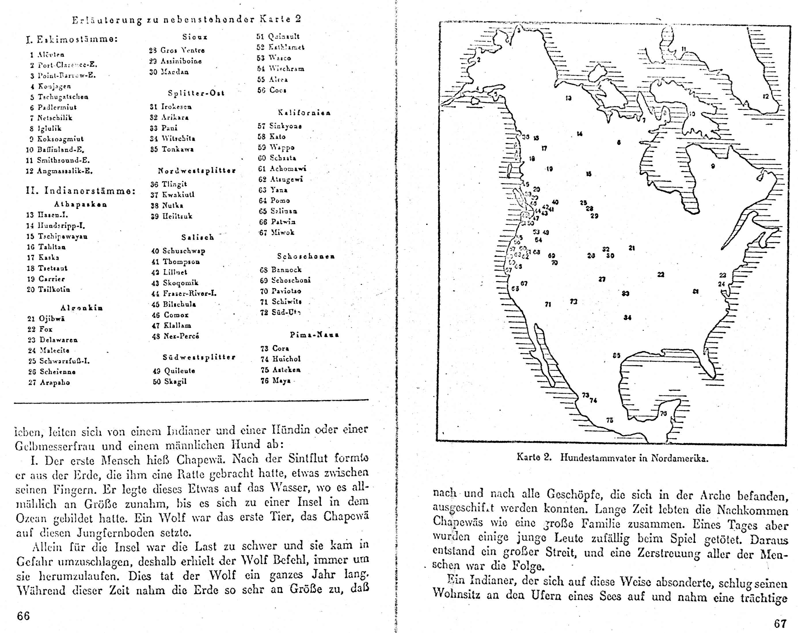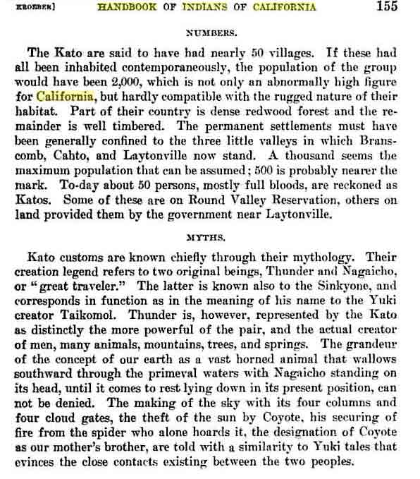 to fish by", die Säule, bei der man angelt. Nicht von Coyoten, und überhaupt von keinem Caniden handelt ein Mythos der Kato-Athapasken in Californien, den ich ihnen gleichwohl nicht vorenthalten will; Kroeber (Handbook 155, s.a. http://en.wikipedia.org/wiki/Alfred_L._Kroeber) fand: "the grandeur of the concept... cannot be denied (s. Beilage 9)." |
