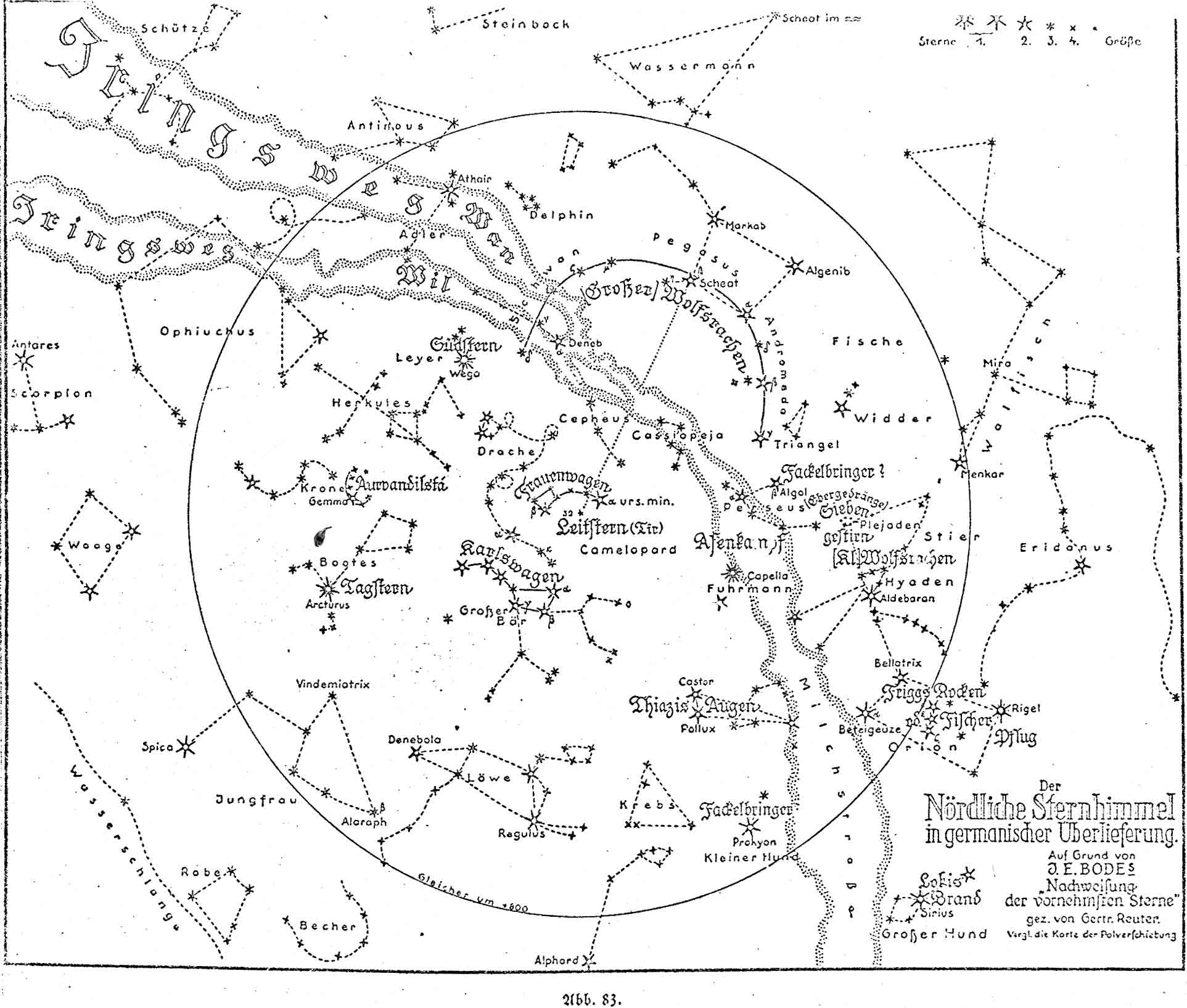 dessen?? Where the dog ran!// Einschub zu p39: Die Cherokee nannten,wie Sie eigentlich inzwischen wissen sollten, die Galaxie "Wo der Hund rannte", wie nachzulesen in Hamlets Mill 249 und im Appendix 17, 387-390. Und das kam so, gemäß James Mooney (Mooney, James. "Myths of the Cherokee," 19th ARBAE 1897-98, Washington, 1900 p259 u p443): "Some people in the south had a corn mill, in which they pounded corn into meal, and several mornings when they came to fill it they noticed that some of the meal had been stolen during the night.They examined the ground and found the tracks of a dog, so the next night they watched, and when the dog came forth from the nor th and began to eat the meal out of the bowl they sprang out and whipped him. He ran off howling to his home in the north, with the meal dropping from his mouth as he ran, and leaving behind a white trail where now we see the Milky Way, which the Cherokee call to this day ....'Where the dog ran'." Bei der Gelegenheit bringe ich in Erinnerung die Mehl klauenden Widder, in den südkongolesìschen und zentralsudanischen Mythen von, aus-gerechnet!, dem Sonnenschlingenfang. Der Sonnenwidder wird bei den Mahlsteinen eingefangen , wovon im letzten Sommersemester gehandelt wurde (Mühle u.Feuerdrill.SS 1979,57 ff.) Maria Leach (p62) liefert uns Zusätzliches: "The Seminole Indians of Florida, of Cypress Swamp and the Everglades, also tell about a dog path in the sky, but for a different reason. They say it is ifi heni, the dog way, by which dogs travel to their heavenly home. It slants up the sky and joins the Milky Way, the spirit road (solopi heni) by which the souls of the good travel to the land of the dead in the West. Long ago the Seminoles used to krall a dog as soon as its owner died, so that it might accompany him to the afterworld.The dog started out an the little path, the dog way, and caught up with his master an the spirit road, and the two went on together. The dog road, ifi heni, is sharply visible in clear nights.The Natchez Indians also call the Milky Way the dog trail." (Gemäß p.406 zu finden in Greenlee: Folktales of the Florida Seminole, JAF 58,138 39) It is not difficult to recognize Antares in the Spirit Star at the southern end of the Milky Way. This star has been the peculiar star of the dead in the Euphratean region, Peru, Qatemala, and many Parts of the world". Ganz so einfach geht's nicht. Einschub Ende p40 Von dem Eskimo Hund, der
