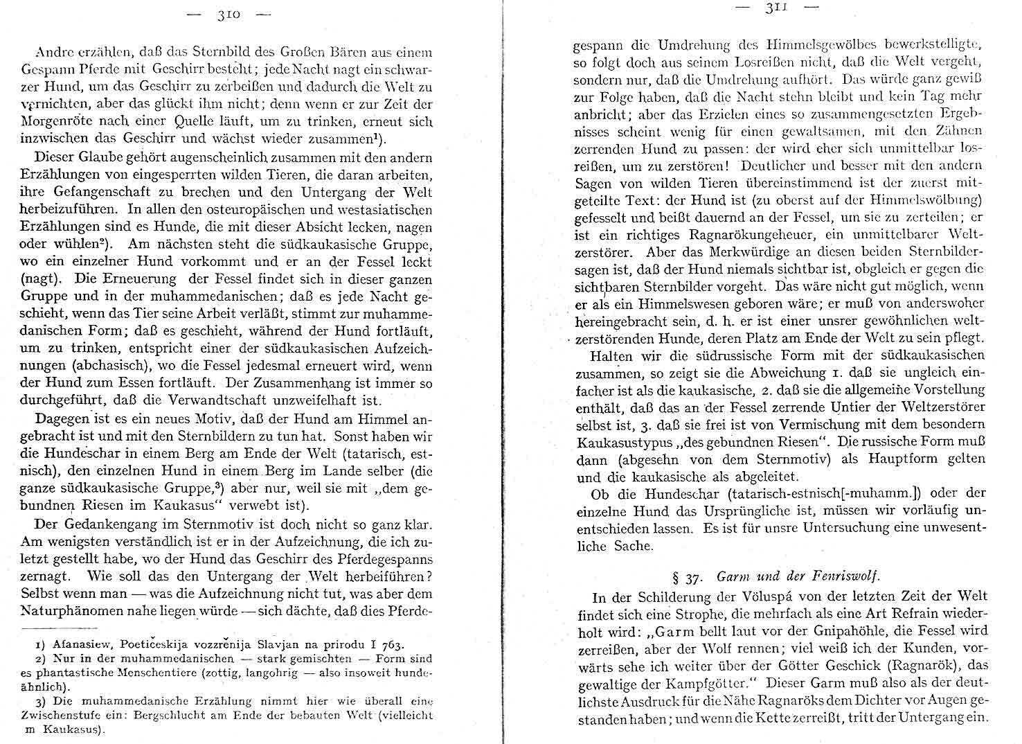 Zur 'Erklärung' der sieben Hunde des Jedai Chan meinte übrigens Olrik (297): "Sieben ist im allgemeinen der Ausdruck der volkstümlichen Sagenwelt für eine große Zahl."Von einem singulären ferrschderlischen Verschlingerhund handelt das Heldenlied von Küreldei Mirgän (Schiedner 219-31, Olrik 295 f ), wenn der auch nicht unverweilt das sog. Weltende herbeizuführen trachtet. In einem estnischen Text (Olrik 298 f.) wird ein Hirtenknabe von einem "Mann auf einem schwarzen Roß" angeheuert, um an einem hohen Berge die Hunde des Mannes zu bewachen, "die in einem Keller im Felsen hinter dreifachen Eisentüren eingeschlossen sind; er soll dafür sorgen, daß sie sich nicht unterhalb der Tür mit den Pfoten herausgraben, denn wird nur einer von ihnen frei, so sind auch die beiden anderen nicht zu halten; sie würden dem Führer folgen und alles Lebendige auf Erden vertilgen; dann hätte die Sonne zum letzten Male geschienen." Olrik wendet sich dann zwei ihm recht unbehaglichen Geschichten zu (309 f.): "Ein südrussischer Volksglaube meldet, daß an das Sternbild des kleinen Bären ein Hund gefesselt ist, aber er arbeitet immer wieder daran, die Fessel durchzubeißen; wenn er das fertig bringt, tritt das Ende der Welt ein.Andere erzählen, daß das Sternbild des Großen Bären aus einem Gespann Pferde mit Geschirr besteht; jede Nacht nagt ein schwarzer Hund, um das Geschirr zu zerbeißen und dadurch die Welt zu vernichten, aber es glückt ihm nicht; denn wenn er zur Zeit der Morgenröte nach einer Quelle läuft, um zu trinken, erneut sich inzwischen das Geschirr und wächst wieder zusammen. (Afanasiew)." Olrik's Kommentar kann ich ihnen nicht ersparen, p 310-311 (s. Beilage 11). p62 Nun, gar so unsichtbar ist zum mindesten einer der jagenden Caniden nicht.Wir hören von den altsibirischen Tschuktschen, die Wagensterne seien 6 Schlingenwerfer, das Paar zeta Ursae und Alcor aber ein Graufuchs, der an einem Paar Rentiergeweihe nagt (nach Bogoras, Gibbon 139). Dazu bemerkte Helmut Werner (ZfE 77,1952.139): "Der Umstand, daß Alcor als ein einzelner und zumal lichtschwacher Stern einerseits im klassischen Altertum Fuchsstern hieß, andererseits bei den Tschuktschen als Graufuchs angesehen wird, stellt wohl das stärkste Argument für die Ableitung der tschuktschischen Sternbilder aus der Antike dar." Des Nagens wegen, verbunden mit einem drohenden sog. Weltende, hat der Olrik auch eine Geschichte mitten in sein Kapitel vom "gebundenen Raubtier" placiert, die er vom Tabari auf dem Umweg über die orientalische Sagensammlung des Joseph Freiherrn von Hammer Purgstall, genannt "Rosenöl" und erschienen 1813 , übernommen hat. Hier kommt die Sprache auch auf Gog und Magog (I 287 91,Olrik 304 f.). Wir umgehen Gog und Magog, ein Riesenthema für sich; Gog ist laut Gen. 10.12 der zweite Sohn Japhets; Hesekiel/Ezechiel hat in seinen Kapitel 38 39 gar Schreckliches über Gog und Magog zu berichten, und die Offenbarung Johannis 20.7 9 verkündet: "Und wenn 1000 Jahre vollendet sind, wird der Satanas los werden aus seinem Gefängnis. Und wird ausgehen zu verführen die Heiden an den vier Enden der Erde, den Gog und Magog, sie zu versammeln zum Streit, welcher Zahl ist wie der Sand am Meer. Und sie zogen herauf auf die Breite der Erde und umzingelten das Heerlager der Heiligen und die geliebte Stadt.Und es fiel Feuer von Gott aus dem Himmel und verzehrte sie." p63 Erneut kreuzen sie unseren Weg im Koran in der berühmtesten aller Suren, der 18., genannt Al Kahf/die Höhle, wo 95 98 Dhul Qarnain, der Zweigehörnte d.i. Alexander, die Mauer gegen Gog und Magog baut. Sie finden reichliche Unterrichtung bei A.R. Anderson: Alexander's Gate, Gog and Magog, and the Inclosed Kations (Cambridge Mass.: Mediaeval Acad.of America 1932) und bei Franz Kampers: Alexander der Große und die Idee des Weltimperiums in Prophetie und Sage (Freiburg: Herder 1901). Das Aussperren dieser Völkerschaften durch Alexanders Mauer für das Schmelzen dieser Mauer durch die Vorfahren der Türken s. R. Hartmann: Ergeneqon, Festschrift Georg Jacob ist nun aber doch nicht das Gleiche wie das Binden eines Ungetüms: der Tabari hat da anscheinend verschiedene Überlieferungen durcheinander gekriegt. Aber auch von den gebundenen 'Unholden', mögen sie nun an Ketten oder Banden nagen oder nicht, sollten wir uns langsam verabschieden, weil wir sonst nicht umhin könnten, uns in die persische Tradition um Angra Mainyu und seine 'Brut', den Azhi Dahak, einzugraben, der im Berge Demawend gebunden liegt (gebunden von Thraetona, s.Olrik 84, 345 ff.), vor dem Endkampf aber loskommt, um dann von Keresaspa endgültig besiegt zu werden (Spiegel II 162 64), und uns einzulassen auf das sog. Welthoroskop im Bundahishn, und von da aus müßten wir uns mit der Typhoneia anlegen und mit einem grauslichen, aber entscheidenden Text genannt "Excerpta ex Astrologo Byzantino" (CCAG), und mit den Gnostikern, weil in den meisten dieser späten Texte, ob persische, griechische oder wie auch immer, wenigstens unumwunden gesagt wird, daß die gebundenen Dämonen Planeten sind, die an den Fixsternhimmel gebunden werden müssen, wie u.a. nachzulesen in Wilhelm Bousset's "Hauptprobleme der Gnosis" (1907, Göttingen 1973 ) im 1.Kapitel "Die Sieben und die Mêtêr", die Mutter (spez.p.47), also die Persephone mit ihren Hunden; nur sind es meist nicht 7 sondern 9, weil der Finsternisdrache, der Typhoeus/ Typhon, ein wichtiges Familienmitglied der "bösen Brut" ist, die aber eben nicht durchgehend "böse" ist (Spiegel; Eranische Überlief.II 140 ff.,180 ff.; Binden des Gandarwa mit eigener Haut s. Hüsing: Iran.Überl.138,140). Und um die allgemeine Diskussion um das "Binden" und "Loskommen", was meist mit Riesen-schlachten, alias Weltalterkrisen verbunden ist, würde ich mich gerne noch drücken, weil das wirklich das Zentralproblem darstellt, genau so wie beim Schach oder beim mexikanischen Ballspiel das Hauptproblem lautet: Wer s i n d denn die 'Mannschaften', die da gegen 