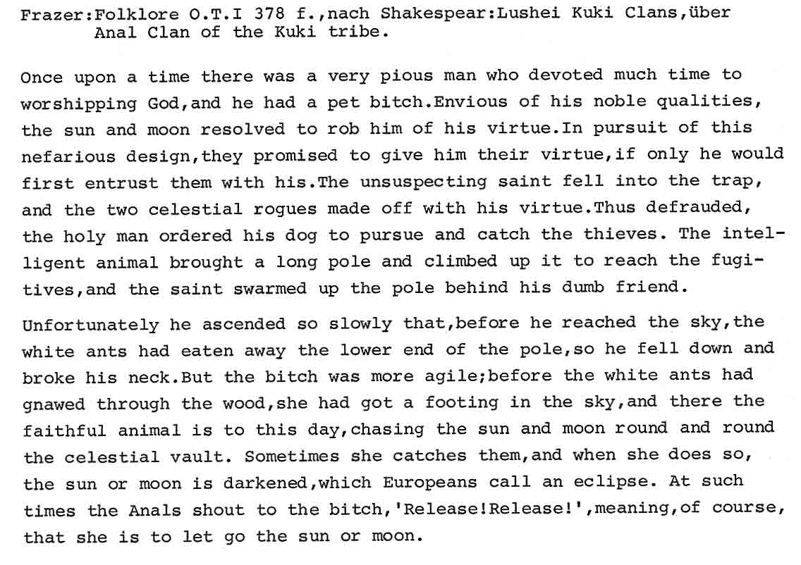 p54 Odysseus erblickt im Hades das e i d ô 1 o n des Herakles, autos de, der Herakles selbst aber weilt unter den Göttern (vgl. Buffière 404,494). Ist das eidôlon das Sternbild, das die Griechen Herakles oder Engonasin, Den auf den Knien, die Lateiner Hercules nannten? (Cf.Boll: Sphaera 100 04; Boll Gundel in Roscher VI, 896 904, Rehm RE V 2563 ff., aber auch Prometheus, Tantalos, Theseus, Ixion, Orpheus). Ob "er selbst", der Herakles, Jupiter sei, oder Mars, darüber haben wir uns ja früher schon den Kopf zerbrochen: Vergil, Macrobius, Achilles Tatios u.a. haben auf der Identität von Herakles und Mars bestanden. Aber selbst, wenn wir der 'Identität' des Herakles sicher wären, wüßten wir noch nicht, was es mit dem Kerberos auf sich hat. Eine eventuell gehegte Hoffnung, ihn unter den sog."Hades-Sternbildern" anzutreffen, ist vergeblich: da findet man das Totenschiff, den Fährmann (porthmeus) Charon, den Acherusischen See, alle im Sagittarius, aber von Kerberos keine Spur (Boll 172 78,246 51). Bezüglich Yamas Hunden hörten wir nur, sie seien sarameisch, was die Indologen als Sprösslinge der Saramâ deuten. Kerberos wurde uns von Hesiod als Sohn von Echidna, der Schlange, und Typhaon bezeichnet, und als Bruder der lernäischen Schlange, des nemäischen Löwen und des Geryon Hundes Orthos oder Orthros, den man mit dem Indra 'Feind' Vrtra zu identifizieren versucht hat (v.Schroeder:Herakl.+ Indra,Abh.III 62 A). Diese genealogische Situation hat eine gewisse Ähnlichkeit mit dem Befund in der Edda, soweit es den wichtigsten nordischen Caniden betrifft, den Fenriswolf. Von dem hören wir im Hyndla Lied 42 und in Snorris Gylfaginning 34, er sei ein Sohn von Loki und Angrboda und Bruder der Hel und der Midgardschlange/Jörmungandr. Wir kommen auf den Casus zurück und versuchen erst, die anderen eddischen Caniden 'vom Tisch' zu bringen, wenn auch unter dem Etikett 'unerledigt': alle einschlägigen Stellen haben Sie vor sich. //oder doch Fiolvinnsmal 13 (Edda ed. Neckel I 303, bei Genzmer II 108: Vers 19): Hunde (garmar), die Gehöft bewachen "bis die Götter vergehen" heißen Gifr und Geri.Neckel II (Glossar) p.57"garmerm.bissiger Hund (eigtl. Name des Ragnarökhundes, VSP 44,49,58) Fi 13"// sie scheiden also zwangsläufig erst einmal aus. Skoll und Hati, nebst Managarm sollen Söhne Fenrirs sein. Wer aber wen verschlingt, das ist mir weder aus den Gedichten, noch aus Snorri oder den modernen Kommentatoren klar geworden. Was die Formulierung von de Vries anlangt von der "allgemeinen Vorstellung, daß ein Ungeheuer in Wolfsgestalt die Sonne bedroht", so ist uns damit wenig geholfen, und gar so allgemein ist sie auch nicht; vielleicht meinte er auch nur bei den Germanen. p55 Um Eklipsen Caniden geschwind nachzutragen: Edward Burnet Tylor (The Origins of Culture = Primitive Culture I, London 1871, Harper Torchbooks 1958,328 ff.) sagt: "The Chiquitos of the southern continent (Amerikas) thought the Moon was hunted across the sky by huge dogs, who caught and tore her till her light was reddened and quenched by the blond flowing from the wounds ...On the northern continent, again,some savages believe in a great sun swallowing dog." Kretschmar (II