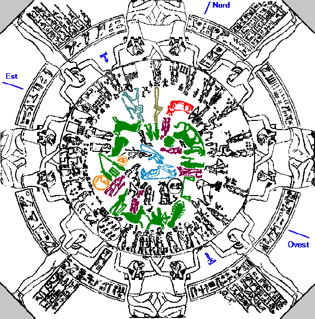 Wie fast überall wird davon ausgegangen,daß es sich bei dem Himmelsstier, der von Enkidu und Gilgamesh getötet wird, um das Sternbild Taurus handele. Die Vermutung liegt nahe, wenn angenommen wird, daß Gilgamesh mit Orion gleichgesetzt wird. Da Gilgamesh nicht nur ein Sternbild repräsentieren kann, sondern auch einen Planeten, und wir dabei davon ausgehen, daß es sich um Saturn handelt, könnte sich die ganze Angelegenheit jedoch auch in der Nähe der Spica (Hauptstern der Jungfrau) abspielen. Spica wird in den babylonischen Schrifen u.a. der Ishtar zugeordnet. Wenn also Ishtar den Himmelsstier an der Leine hält, wie im Mythos beschrieben, könnte damit die Linie am Himmel gemeint sein, die den Großen Wagen über Arctur mit Spica verbindet. Die nebenstehende Grafik(1) verdeutlicht dies. Daß der Große Wagen mit dem Stier zu tun hat, geht aus der Benennung hervor, die ihm altägyptische Astronome gaben, Mashketi, der Stierschenkel. Und diesen wirft Enkidu der Ishtar vor die Füße. Damit wäre astronomisch jedoch noch nichts zu dem Vorgang ausgesagt. Dieser läßt sich erst unter dem Aspekt der Bedingungen erklären, die verantwortlich für das Ende eines Weltzeitalters sind. 2) Zodiak von Dendera