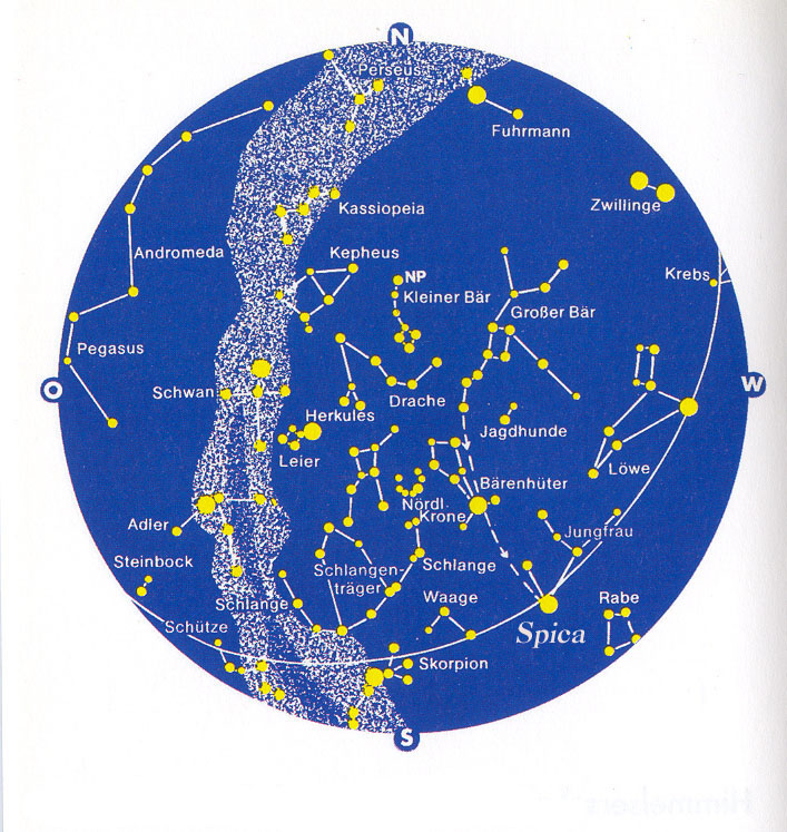 3) Ein Welt-Zeitalter endet nach definierten Vorgaben. Es darf das entsprechende Sternbild (zum Frühlingsanfang) nicht mehr helaikisch sichtbar sein; es muß der Kolur am Sommersolstitz vom das Zeitalter bestimmenden Wagenstern weggewandert sein. Nebenstehende Grafik, die durch Anklicken vegrößer dargestellt wird, will das verdeutlichen. Hier läuft der Solstitial-Colur für das Jahr -4250 durch h-Ursae maioris, im arabischen Benetnasch, das Klageweib genannt. Dieser Stern müßte Saturn zugeordnet sein, da er der Herrscher des "Goldenen Zeitalters" war und durch diesen Vorgang seine Herrschaft verlor.