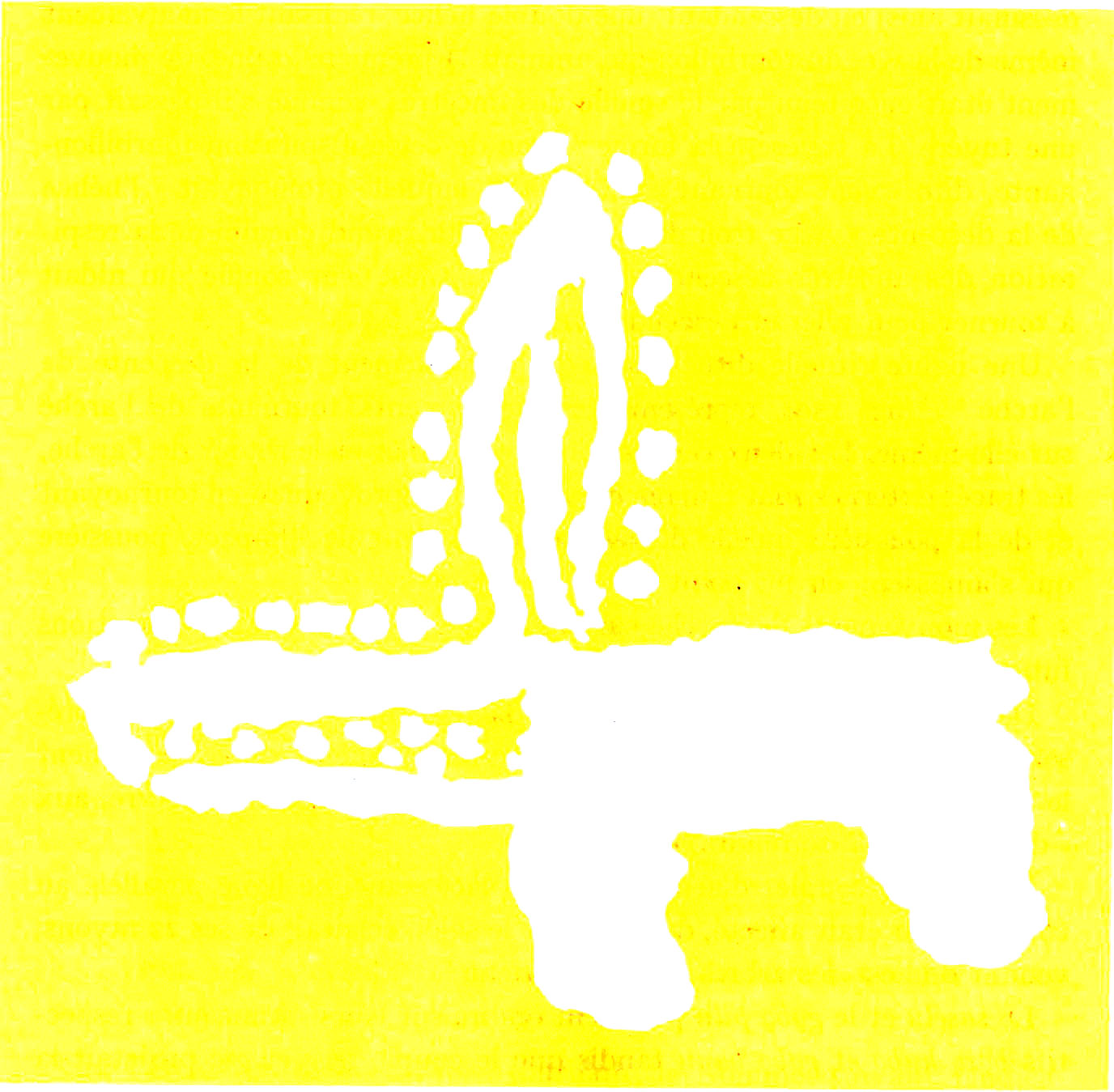 Amma entließ also die so beschaffene Arche aus seinem Schoß und ließ sie auf die Erde herabsinken, gefüllt mit allem, was er erschaffen hatte; sie kam durch die Öffnung herab, die er in den Himmel einfügte, um die Sonne "herauszulassen", die "er dann in den Westen schubste". Man sagt, daß die Arche bei ihrem acht Perioden währenden Niedersinken am Himmel hin und her schwang. Sie nahm dabei den ganzen Himmel ein, von einem Horizont zum andern, wie ein ganz großer "irdischer Bogen", der sich von Ost nach West erstreckte. Sie schwang von Nord nach Süd und wieder zurück, in einem von Wolken vollbehangenen Himmel. "Der darauf gelegte Kasten schaukelte acht Jahre lang. Die Begrenzung des Kastens ist der Osten und der Westen. Sie schaukelt einmal, indem sie sich nach Süden neigt und dann nach Norden". Der Ausstieg aus dem Schoß Ammas und das Niedersinken der Arche wird durch eine rituelle Zeichnung wiedergegeben, die amma bara genannt wird, und an der Decke der Yugo Dogoru-Höhle, imina sommo genannt (Fig. 158) ausgeführt wird, die unter dem Felsen gelegen ist, der den Fuß des Nommo titiyayne darstellt, wie er damit die Plazenta des FUCHSES herausreißt"[1] . Die Lage der Zeichnung - sie ist ausgerichtet - bezeugt, daß die Ereignisse, die sie erzählt, im Himmel stattfanden: im Westen befindet sich das Ei oder die Schlüsselbeiner Ammas, umgeben von Punkten, die die yala aller Dinge sind, die er erschaffen hat; sie verteilen sich auf der Arche, die durch den nördlichen Teil der Zeichnung dargestellt ist. Das Ganze Gebilde, das horizontal von Nord nach Süd ausgerichtet ist, zeugt von dem Schaukeln beim Niedersinken der Arche; der nördliche Teil ist viel größer als das, was in den Süden gemalt wurde; ihre Kleinheit ist mit der Tatsache verbunden, daß all das, was auf der Erde lebt, sterben muß, und deshalb nach Süden zusteuert[2] . Das Rechteck im Osten ist die auf den Boden gestellte Arche.