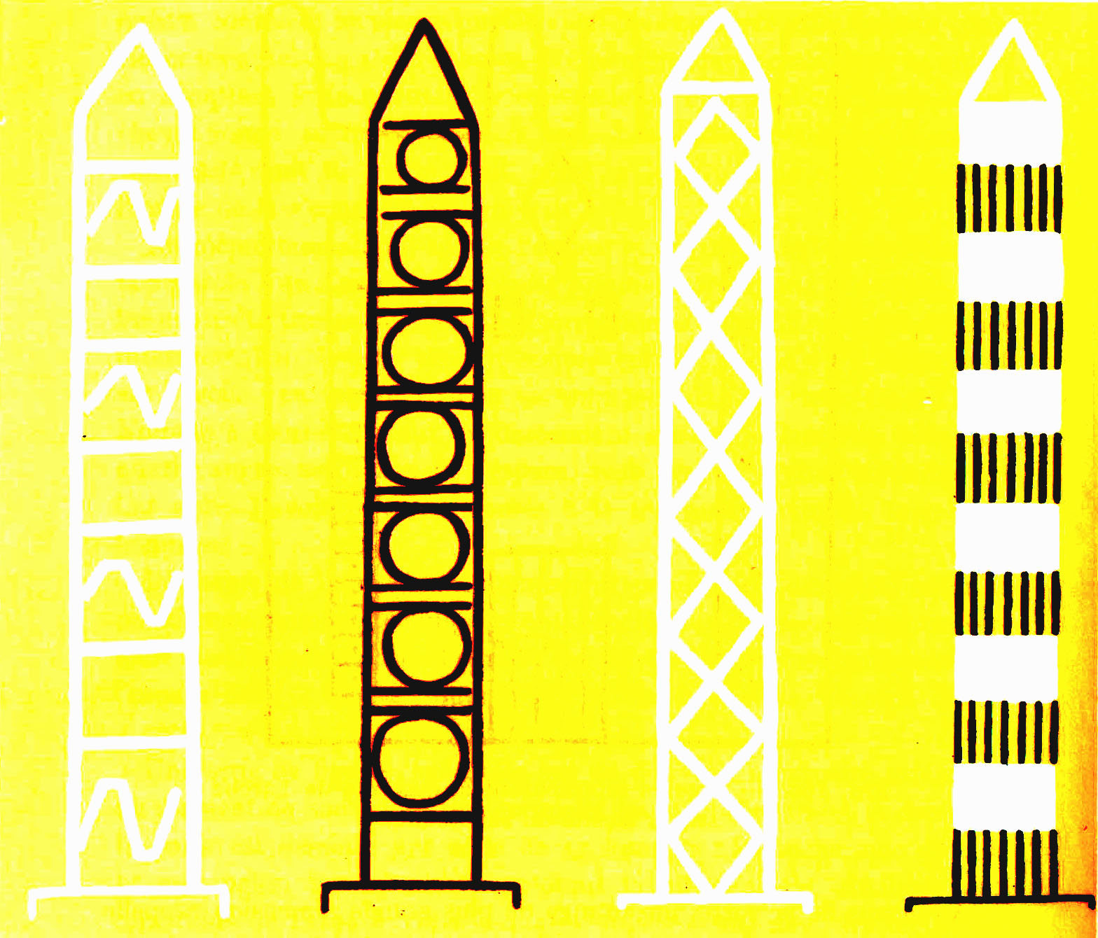 Fig. 159 - die tonu des kreiselnden Herabsinken der Arche. Auf der Arche, die drehend nach unten sank, bestimmte der Nommo, den Indizien der Schatten der Bäume folgend, indem er sie ausfindig machte, die vier Himmelsrichtungen. Diese Bewegung teilte auch die Zeit in vier Perioden, die die Jahreszeiten bestimmten: bado "angekommener Vater" In ähnlicher Weise entstand so auch das Jahr, währenddem der