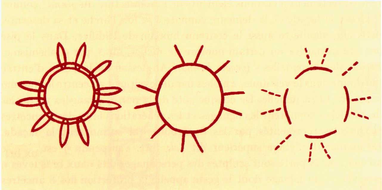 Fig. 162 - yala, tonu und toy des ie pelu tolo (von links nach rechts) Die Zkizze des yala besteht aus einem Kreis, der aus 4 Elementen besteht,
